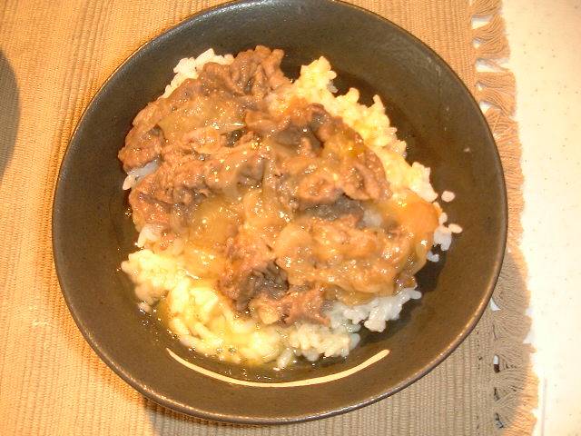 <牛丼> お肉が安かった時に作ります。吉野家なみの味ですよ・・・・ |