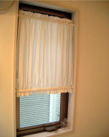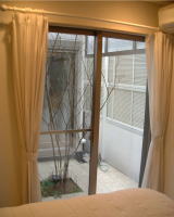 隣家から見えない中庭に面しているので、カーテンは薄めで光を通しやすい生地を使っている。西側の窓のカーテン?もフェンスで隣からは見えないことを考えて、レースのカフェカーテンのみにしている。