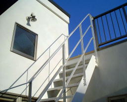 屋上に続く階段は本当は中に入れたかったのだけど、建蔽率の関係で外階段にするしかありませんでした。庇がないので、サンダルなどが濡れること以外はそれほど問題はありません。予算の関係でアルミ製の階段を作れず鉄製(特注)になっているので、錆が発生しやすい点とその汚れが白い壁に影響を及ぼしている点は避けられないのでその点は問題点ですね。この地域は第一種低層住宅地域で10m以上の建築物を建てれないということもあって、360度の景色を見ることができます。と言っても空以外見るべき風景は特にありませんが・・・。春から秋にかけては屋上でビールを飲みながらゆっくりできるのはとてもいいですね。これは最高の気分になります。近くの花火大会も屋上でビール片手に見ることができます。