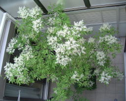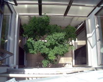 中庭のシンボルツリーは「アオダモ(トネリコ)」です。中庭はお風呂やリビングなどから見えるので季節を感じることができる落葉樹であり、あまり虫がつかないのが剪選定条件でした。その中でアオダモの白い花がとても気に入り、アオダモに決めました。そして花は大正解!!とても綺麗なのです。・・・・・しかし、花が散った後の後始末がとても大変でした。落ち葉のようにほうきで掃くにもいかず、壁や窓にくっついてしまうという最悪の事態。なにげに春がくるのが嫌な気分にさせてくれる要因の一つになってしまいました。でも花はやはりかわいいですよ。